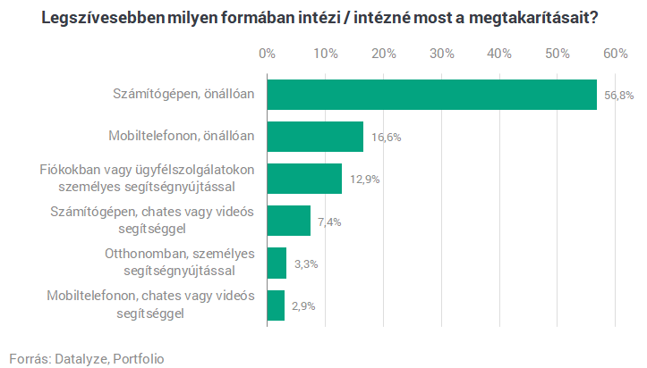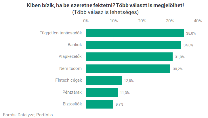 ami meglepett, hogy független tanácsadókban, bankokban, alapkezelőkben bíznak meg a legjobban.. ja meg a nemtudomban XD és köv grafikonon számítógépen, mobilon önállóan intézi a megtakarításait... gyerekek neeee, a magyar ennyire megbízik a bankokban, alapkezelőkben, független sarlatánokban?